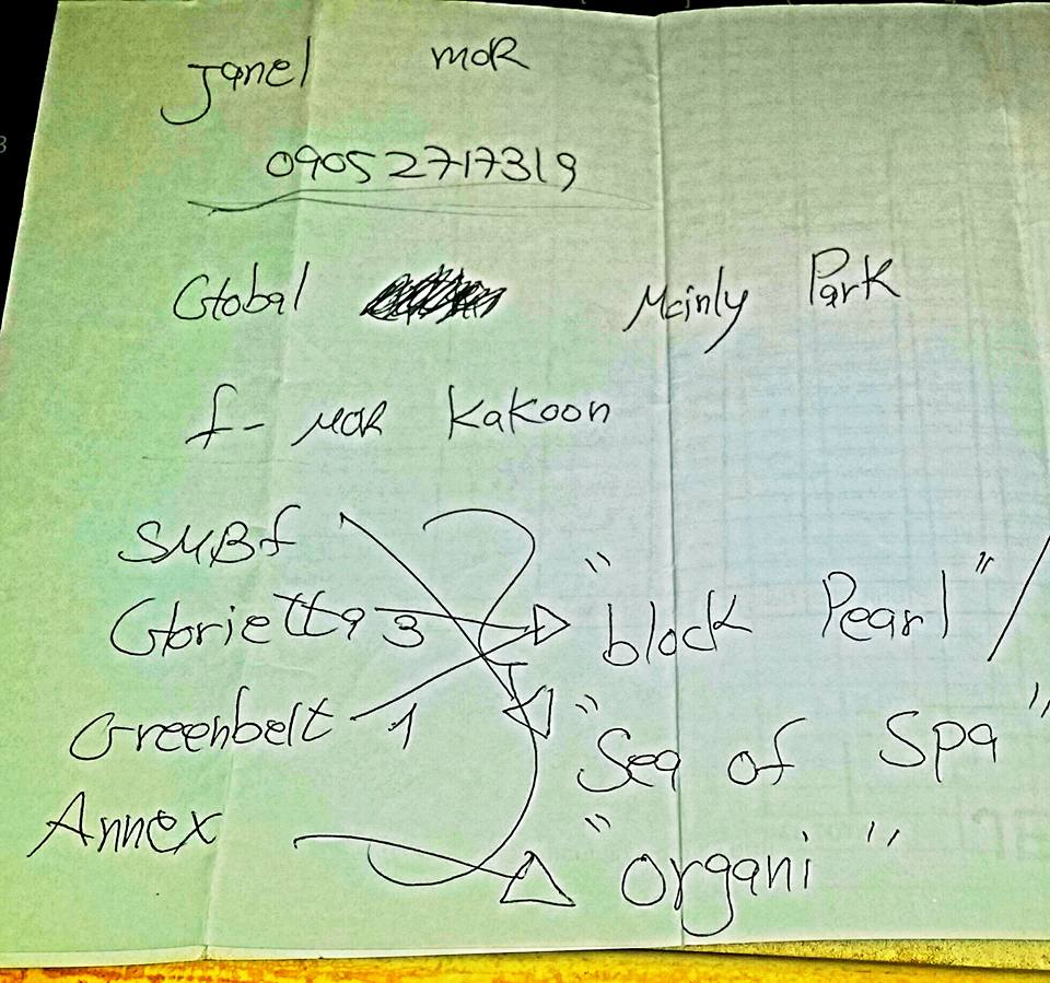 She also wrote down her name, the general area where she lives, her number and where to find her so I can avail of free gold facials.
