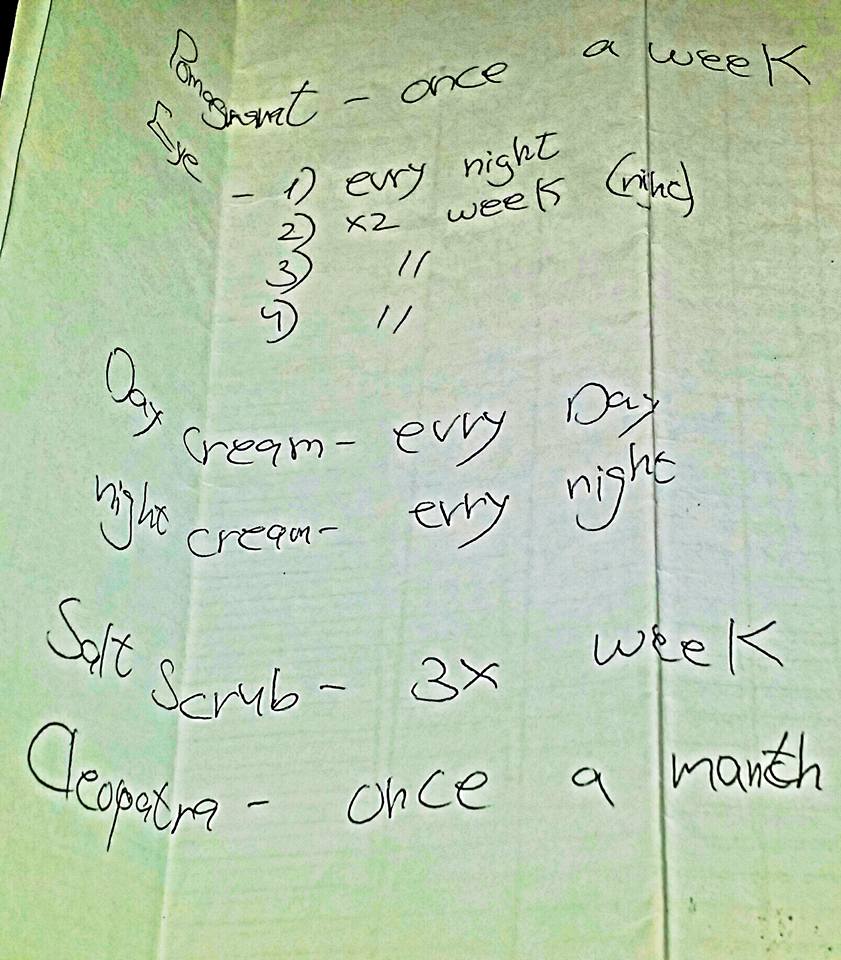 Days and weeks passed by and I would use the Jericho products religiously for about a month. I still have here the handwritten instruction of Janel Mor, the skincare specialist who sold me these products and told me which products to use and how often: