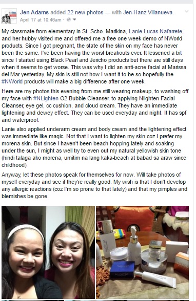 My classmate from elementary in St. Scho. Marikina, Lanie Lucas Nafarrete, and her hubby visited me and offered me a free one week demo of NWorld products. Since I got pregnant, the state of the skin on my face has never been the same. I’ve been having the worst breakouts ever. It lessened a bit since I started using Black Pearl and Jericho products but there are still days when it seems to get worse. This was why I did an anti-acne facial at Marissa del Mar yesterday. My skin is still not how I want it to be so hopefully the #NWorld products will make a big difference after one week.