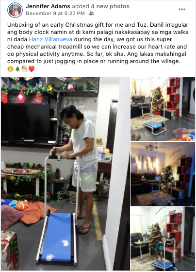 Mahal is always on the go either biking with his friends or asking me and Tuz to go walking, running, jogging, or hiking with him. But because my body clock is irregular (same as Tuz’s), there are days or weeks that I just can’t join him. So to solve my problem of sedentary living, I got this treadmill for only P3700 from Shopee. It works! Only a minute on this thing and I’m already catching my breath! Nice!