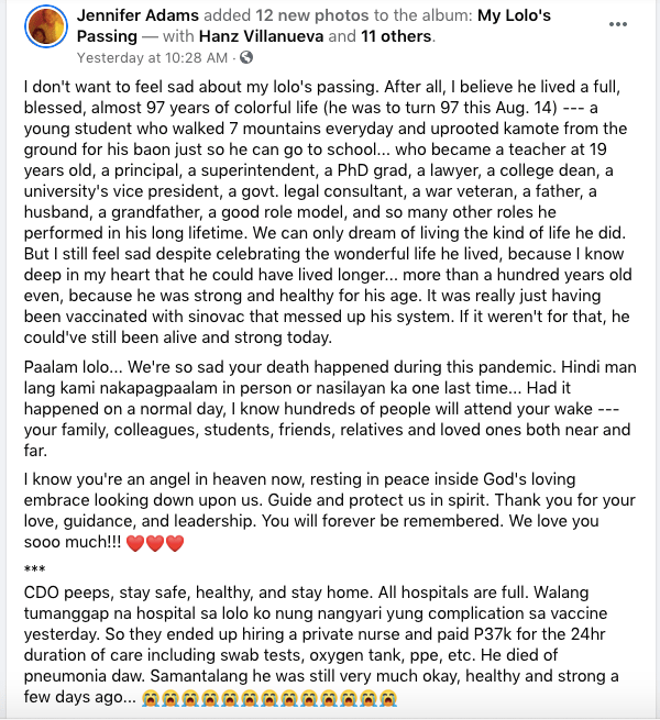 It is our family’s theory that it’s all because he got vaccinated with Sinovac recently… Though official WHO (World Health Organization) findings reported that various Covid-19 vaccines pose as no threat to human health, and that the benefits of taking the doses far outweigh the risks, there is still news circulating about some people experiencing complications from getting vaccinated, one of which is dying. I’ve been seeing real-life accounts of both people I know and don’t know saying how the vaccines caused them grave illnesses with some eventually dying like my Lolo when they were otherwise in good health prior to getting those jabs. Getting that vaccine for my Lolo was the only thing he did differently in his routine in the last few weeks. And suddenly, he couldn’t breathe… He died of pneumonia according to my step-grandma. He was still very much alive and well just a few days prior to this.