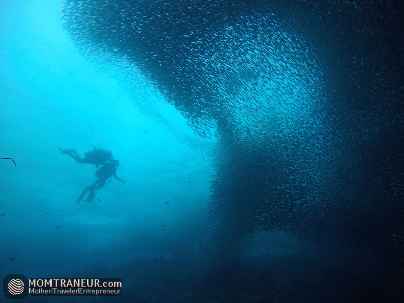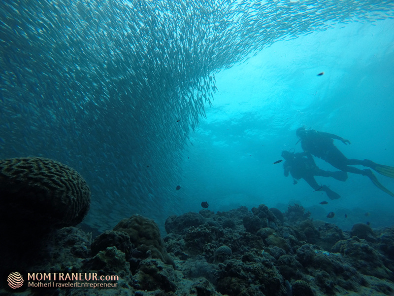As for me and Tuz, we just snorkeled so we can take a peek at Mahal down below and the amazing view of the sardines. These photos below show me, Tuz and the gentle boatmen while we were snorkeling to see the sardine run while also holding on to our flotation device because the current was too strong. Perhaps, when Tuz is older, he can try scuba diving too, like his dada.