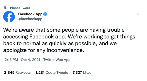 “These outages come just one day after a bombshell 60 Minutes interview with current Facebook employee Frances Haugen, who was unveiled to be the whistleblower behind a trove of leaked documents detailing public safety issues with the company. The hashtags #FacebookDown and #InstagramDown are currently trending on Twitter.”