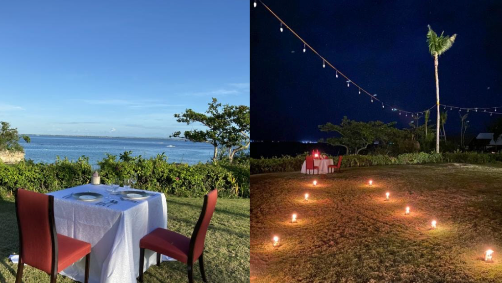 A romantic fine-dining set up like this complete with a beautiful bouquet of flowers, lighting, rose petals, a bottle of wine and 4-course meal costs P15,000.